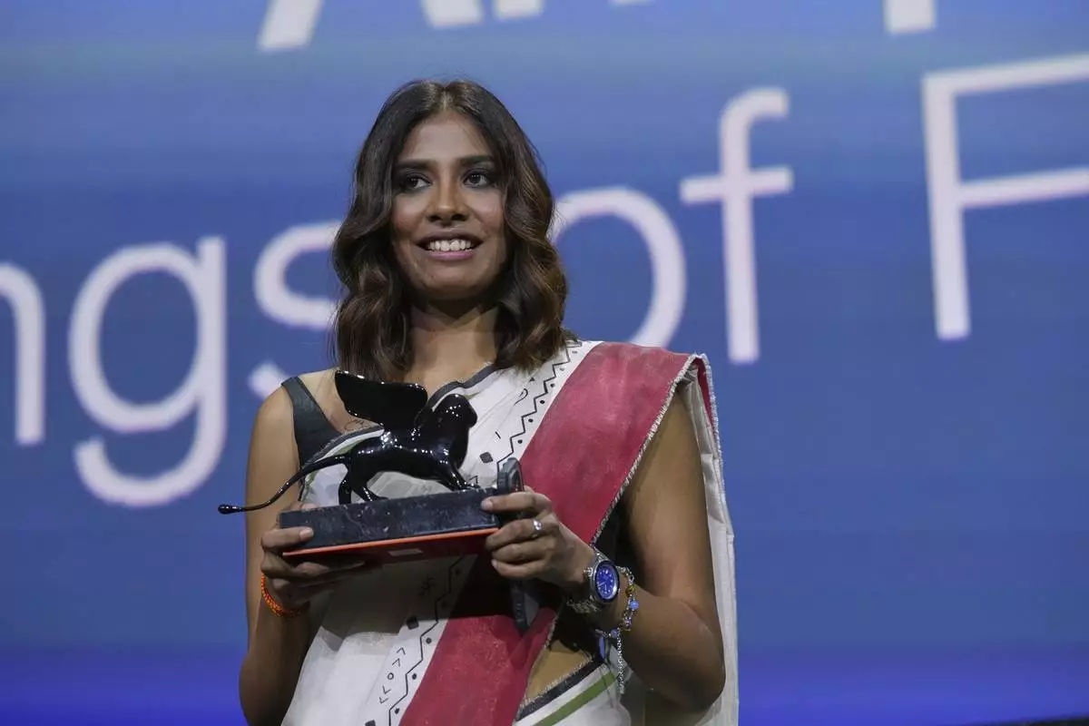 Anuparna Roy accepts the Orizzonti best director award for 'Songs of the Forgotten Trees' during the awards ceremony of the 82nd edition of the Venice Film Festival in Venice, Italy, on Saturday, Sept. 6, 2025. (Photo by Alessandra Tarantino/Invision/AP)