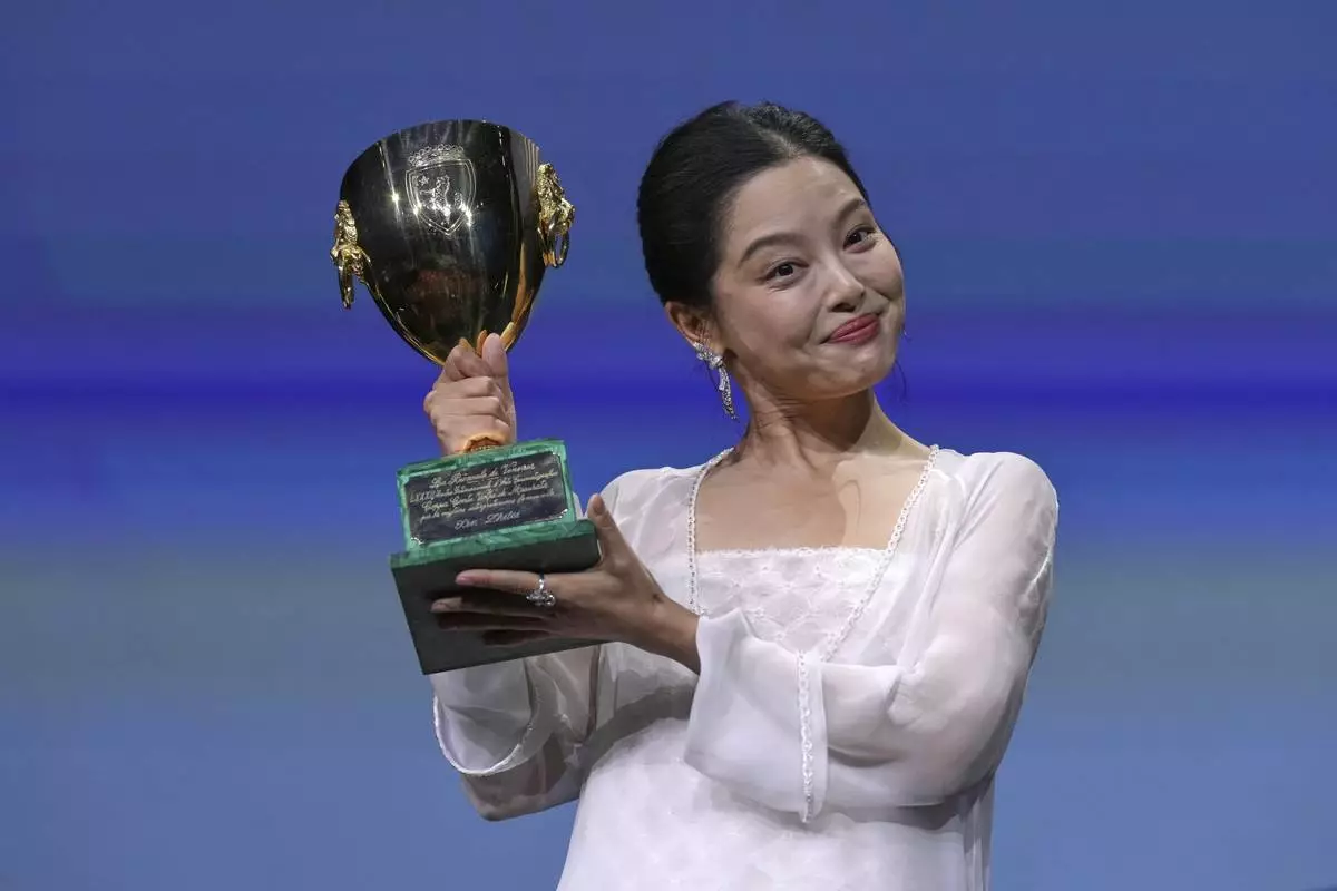 Xin Zhilei accepts the Coppa Volpi award for best actress for 'The Sun Rises on Us All' during the awards ceremony of the 82nd edition of the Venice Film Festival in Venice, Italy, on Saturday, Sept. 6, 2025. (Photo by Alessandra Tarantino/Invision/AP)