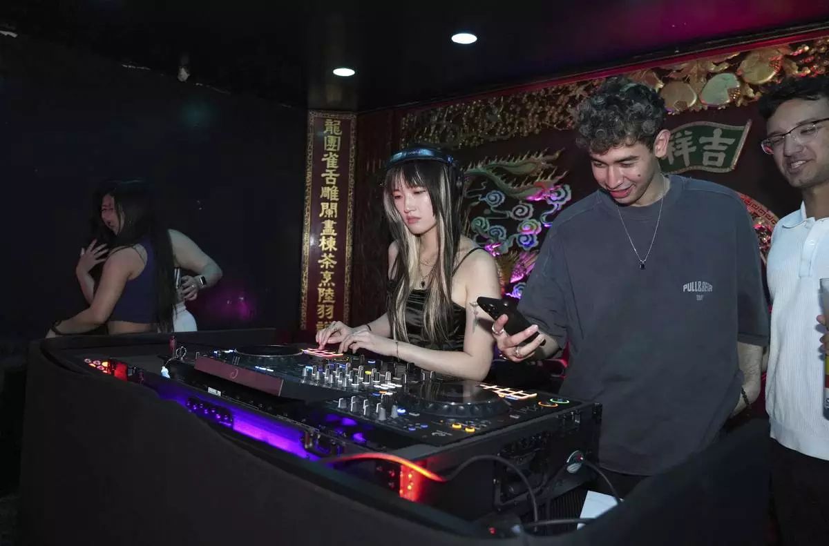 A DJ plays music at an event organized by the YLL Mahjong Club on Friday, Aug. 15, 2025, in San Francisco. (AP Photo/Terry Chea)