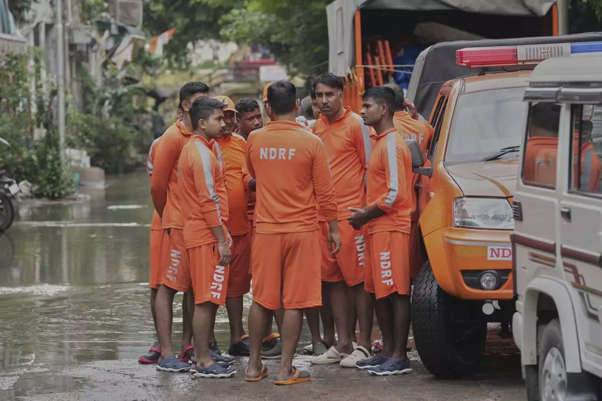 Soldiers from National Disaster Relief Force talk before starting the rescue operation after the river Yamuna, swollen by incessant rain in the higher regions, overran its banks, in New Delhi, India, Friday, Sept. 5, 2025. (AP Photo/Manish Swarup)