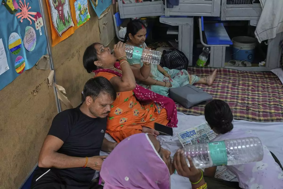 Bindu Pandey, center, drinks water after reaching in a temporary school shelter, which houses residents displaced from the banks of the Yamuna River by incessant rain in the higher regions in New Delhi, India, Friday, Sept. 5, 2025. (AP Photo/Manish Swarup)