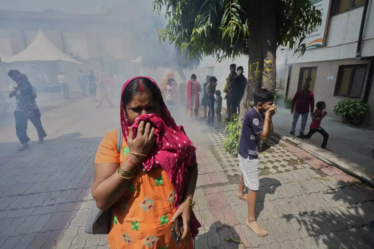 Bindu Pandey, center, cover her nose as officials fumigate in a temporary school shelter, which houses residents displaced from the banks of the Yamuna River by incessant rain in the higher regions in New Delhi, India, Friday, Sept. 5, 2025. (AP Photo/Manish Swarup)