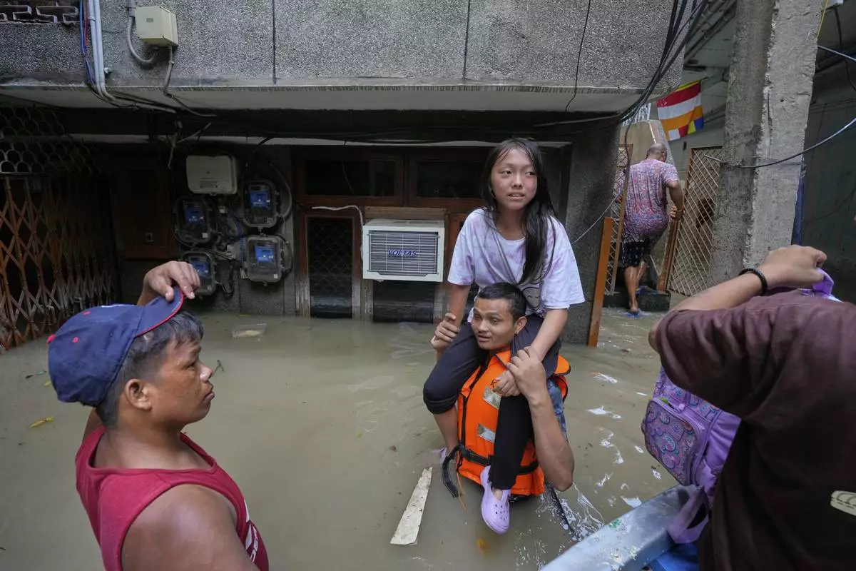 A volunteer lifts a young girl onto his shoulders, carrying her to a safer place after evacuating her and others by boat after the river Yamuna, swollen by incessant rain in the higher regions, overran its banks, in New Delhi, India, Friday, Sept. 5, 2025. (AP Photo/Manish Swarup)
