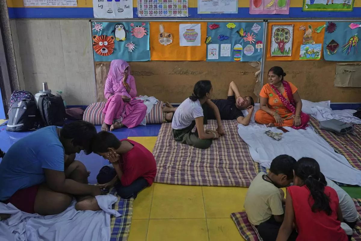 Bindu Pandey, right, talks to her relatives in a temporary school shelter, which houses residents displaced from the banks of the Yamuna River by incessant rain in the higher regions, in New Delhi, India, Friday, Sept. 5, 2025. (AP Photo/Manish Swarup)