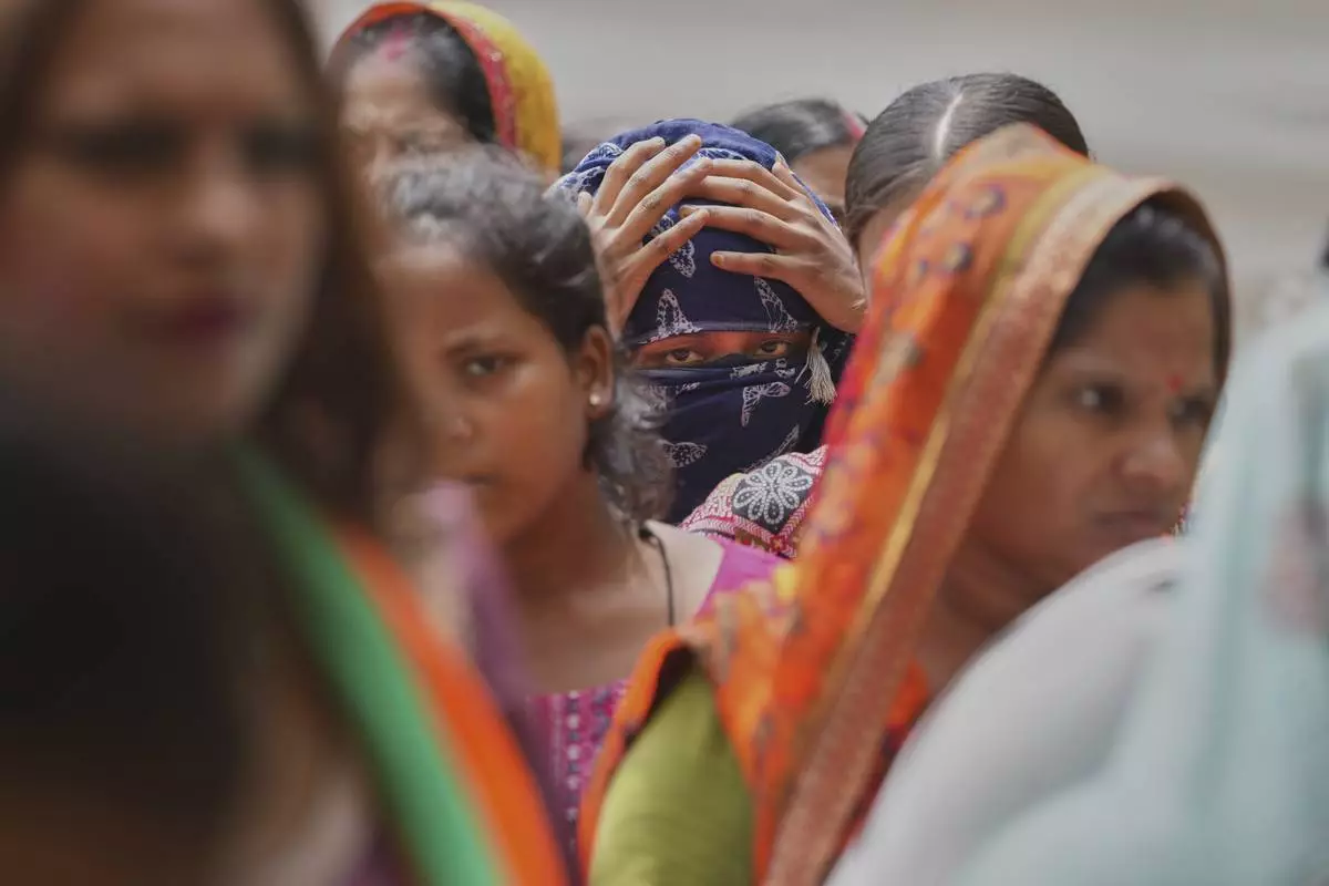 People stand in a queue for food in a temporary school shelter, which houses residents displaced from the banks of the Yamuna River by incessant rain in the higher regions in New Delhi, India, Friday, Sept. 5, 2025. (AP Photo/Manish Swarup)