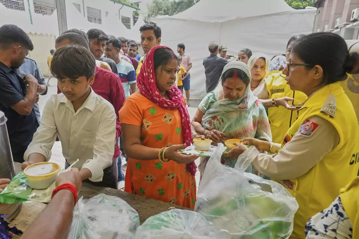 Bindu Pandey, center, takes food in a temporary school shelter, which houses residents displaced from the banks of the Yamuna River by incessant rain in the higher regions in New Delhi, India, Friday, Sept. 5, 2025. (AP Photo/Manish Swarup)