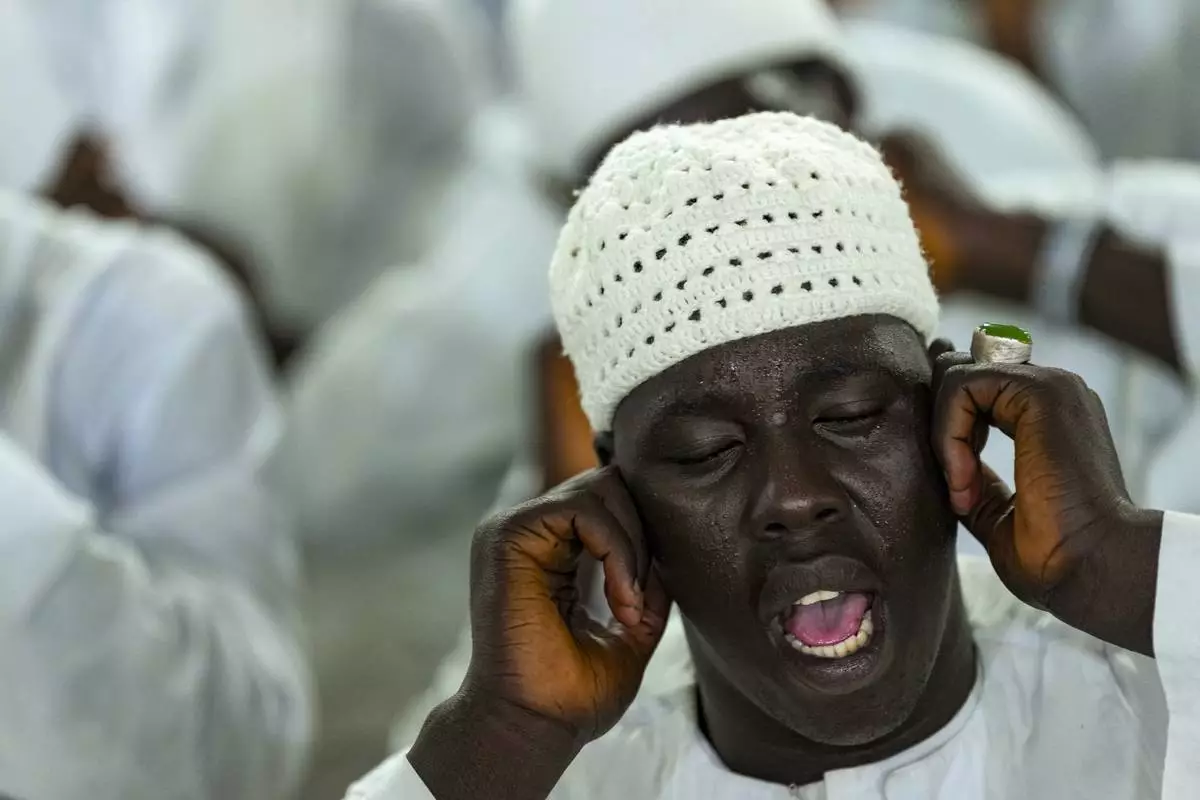 Men sing and gesture as they mark Prophet Muhammad's birthday, known as Mawlid, in Dakar, Senegal, Friday, Sept. 5, 2025. (AP Photo/Misper Apawu)