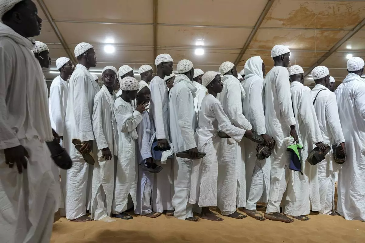 Men and boys in white robes gather for night prayers as they mark Prophet Muhammad's birthday, known as Mawlid, in Dakar, Senegal, Thursday, Sept 4, 2025. (AP Photo/Misper Apawu)
