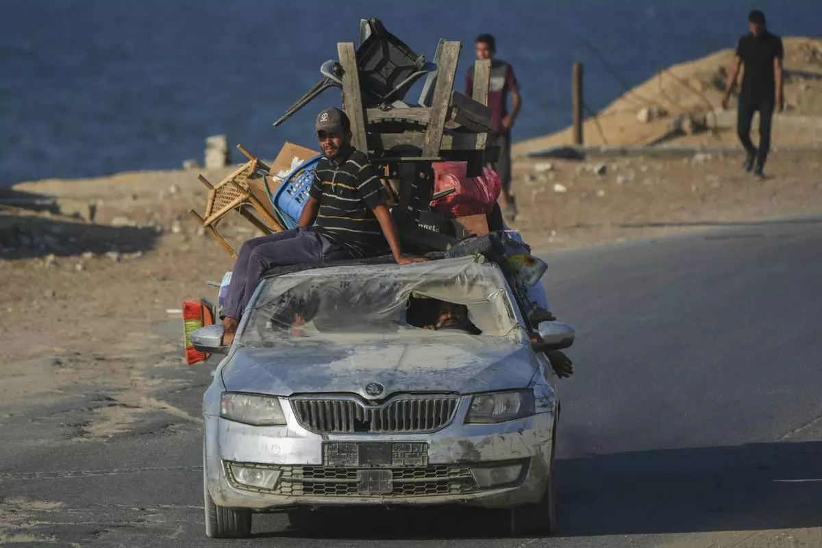 Displaced Palestinians fleeing northern Gaza carry their belongings in a car along the coastal road toward southern Gaza, Friday, Sept. 5, 2025. (AP Photo/Jehad Alshrafi)