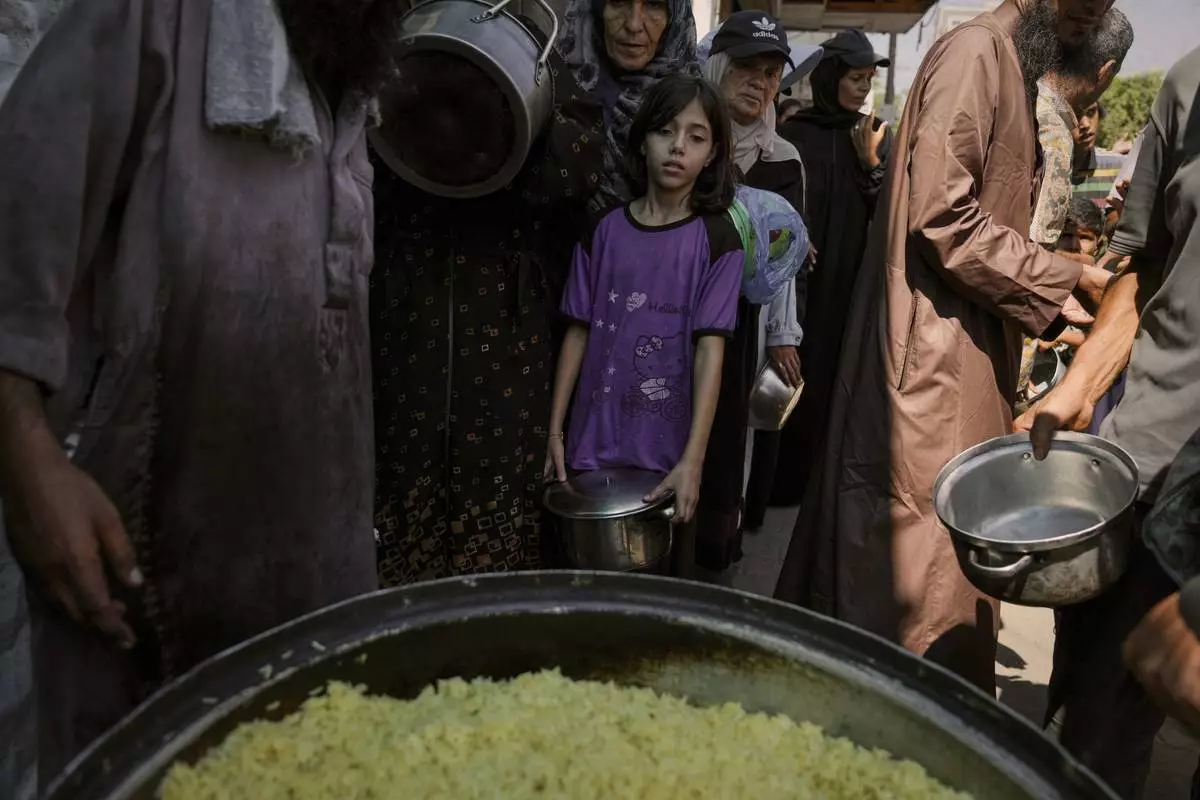 Palestinians line up to receive donated food at a community kitchen in Deir al-Balah, southern Gaza Strip, Saturday, Sept. 6, 2025. (AP Photo/Jehad Alshrafi)