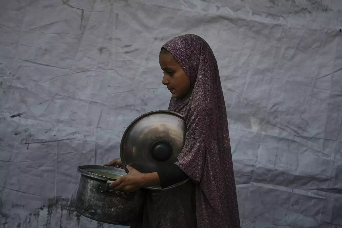 A Palestinian child carries a pot of donated food from a community kitchen in Deir al-Balah, southern Gaza Strip, Saturday, Sept. 6, 2025. (AP Photo/Jehad Alshrafi)