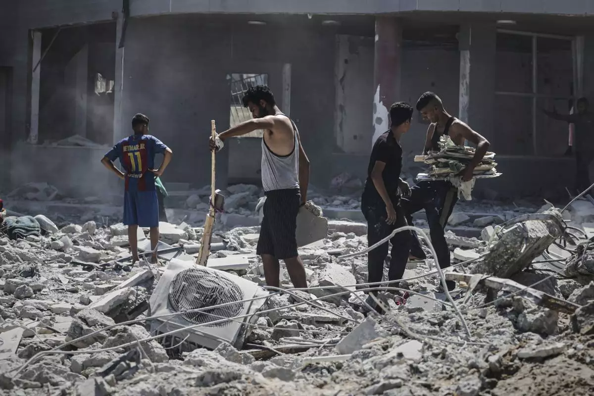 Palestinians inspect the damage after an Israeli army airstrike on a high-rise building in Gaza City, Friday, Sept. 5, 2025, after the Israeli army issued a prior warning. (AP Photo/Yousef Al Zanoun)