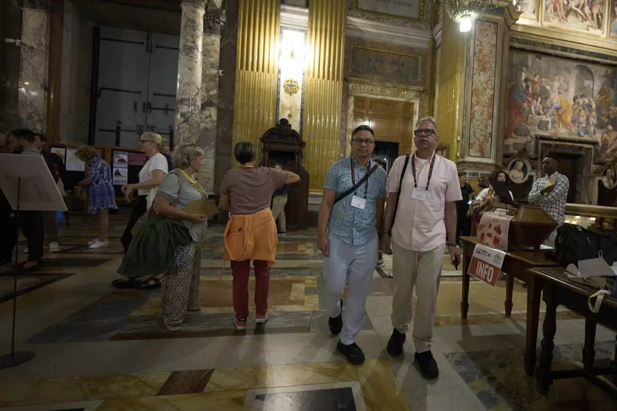 Justin Del Rosario, left, and John Capozzi arrive to attend attend a vigil prayer for members of the LGBTQ+ community in the Church of the Gesu' in central Rome, Friday, Sept. 5, 2025. (AP Photo/Andrew Medichini)