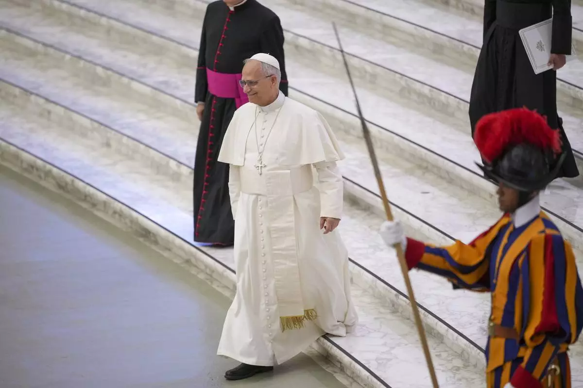 Pope Leo XIV attends an audience with the participants into a religious congress, Saturday, Sept. 6, 2025. (AP Photo/Andrew Medichini)