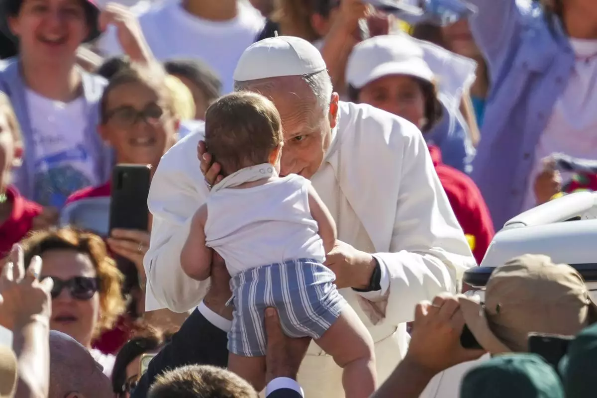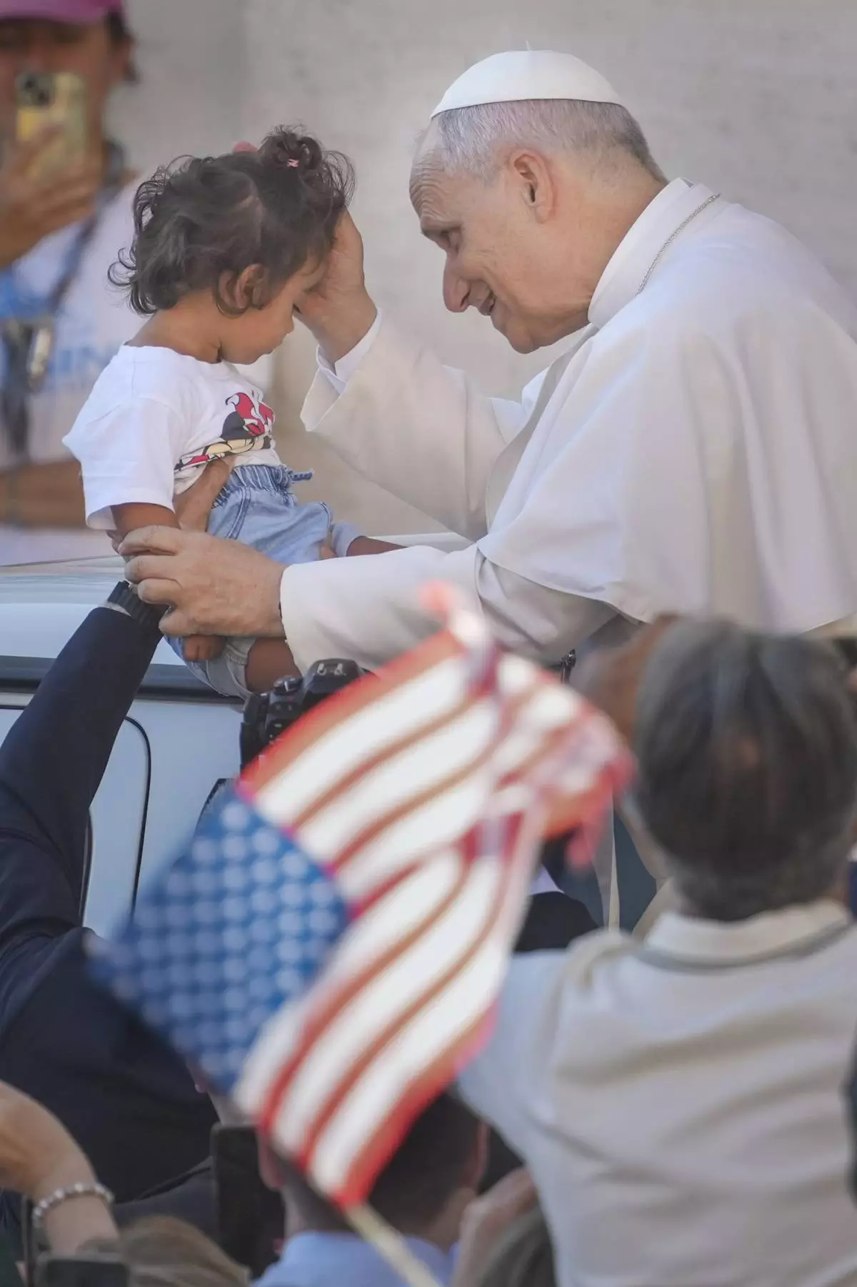 Pope Leo XIV arrives in St. Peter's Square at the Vatican for an open-air jubiliar audience Saturday, Sept. 6, 2025. (AP Photo/Andrew Medichini)