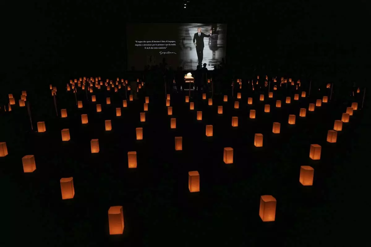 Inside the theater, where Armani took countless bows, his casket was positioned amid rows of candle-lit paper lanterns that cast a shimmering light. Piano music by Italian composer Ludovico Einaudi played softly in the background and the scent of incense filled the air.