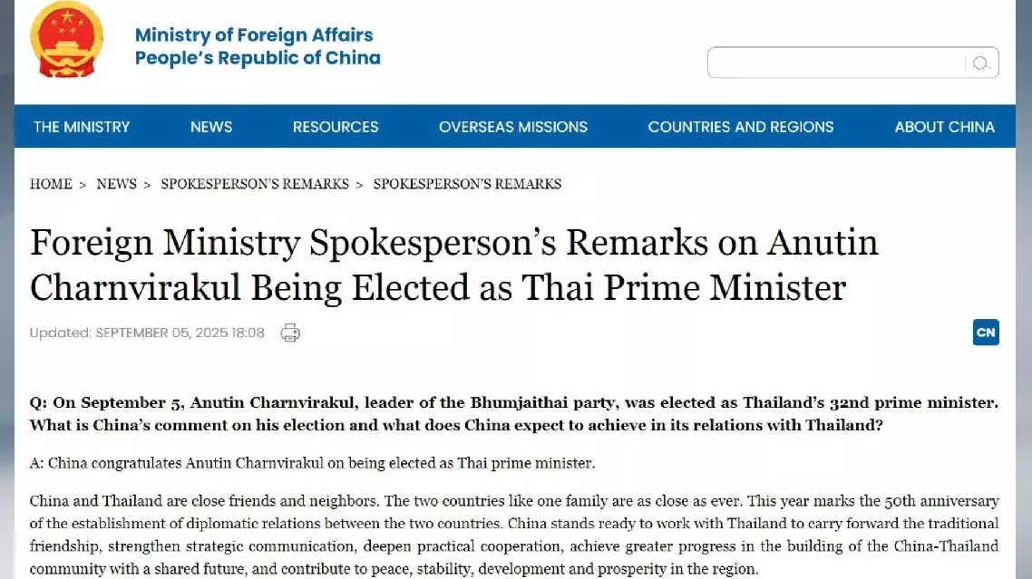 China congratulates Anutin Charnvirakul on being elected as Thai prime minister, a Chinese foreign ministry spokesperson said on Friday.