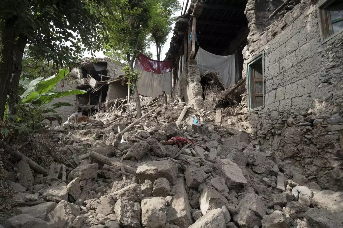 A village lies in rubble after Sunday night's powerful 6.0-magnitude earthquake that struck several provinces, in a remote valley in Kunar province, Afghanistan, Tuesday, Sept. 2, 2025. (AP Photo/Nava Jamshidi)