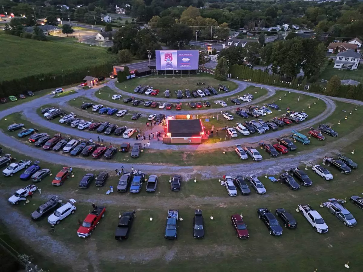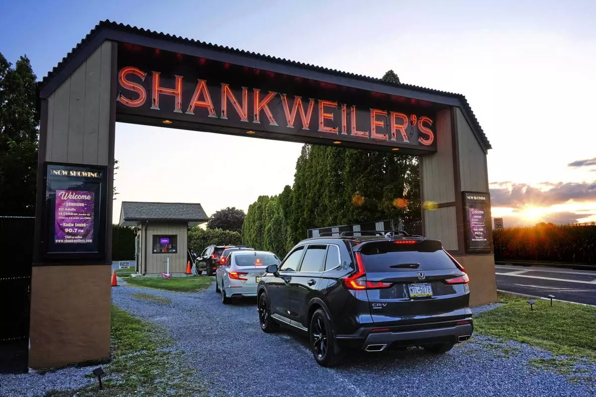 The sun sets on the Shankweiler Drive-In as cars arrive for the evening's double feature of "Jaws" and "Twisters" in Orefield, Pa., Friday, Aug. 29, 2025. (AP Photo/Gene J. Puskar)