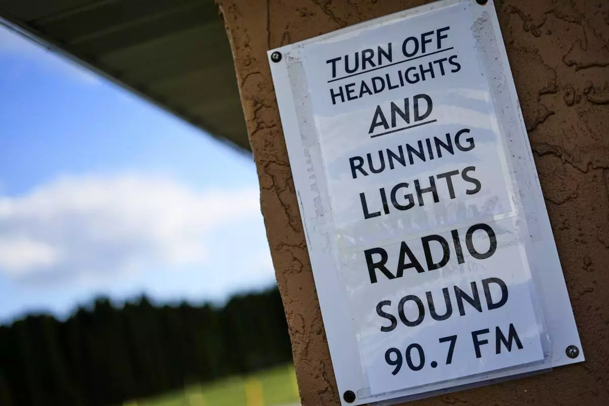 A reminder to turn off head lights at the entrance to Shankweiler Drive-In in Orefield, Pa., Friday, Aug. 29, 2025. (AP Photo/Gene J. Puskar)