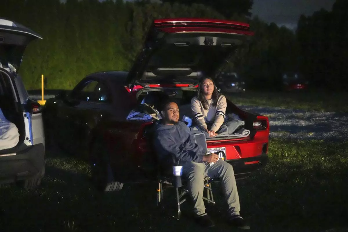 A couple watches the movie "Jaws" at the Shankweiler Drive-In in Orefield, Pa., Friday, Aug. 29, 2025. (AP Photo/Gene J. Puskar)