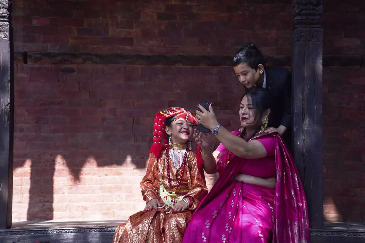 A Newar woman takes a selfie with her young daughter, dressed to represent divine female energy, and her son as they wait for Kumari Puja, a ritual during which the young girl would be worshipped, at Hanuman Dhoka, Basantapur Durbar Square, Kathmandu, Nepal, Friday, Sept. 5, 2025. (AP Photo/Niranjan Shrestha)