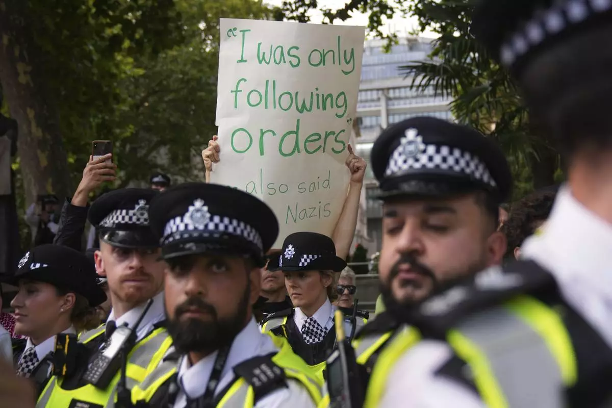 Police officers block a protest to support Palestine Action in London, Saturday, Sept. 6, 2025.(AP Photo/Joanna Chan)