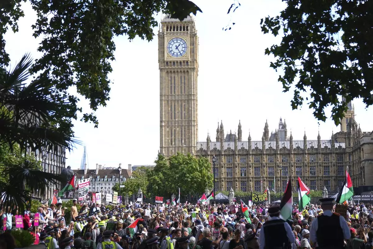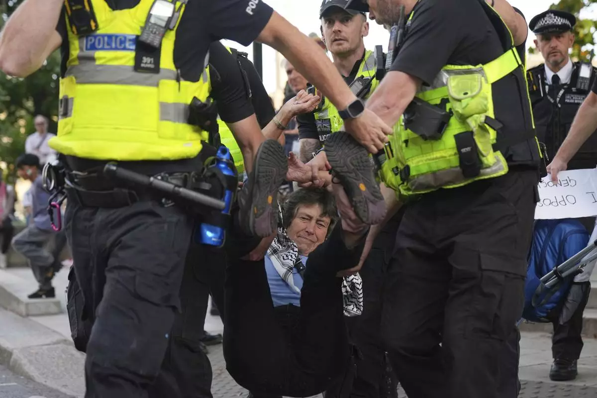 LONDON (AP) — British police scuffled with protesters outside Parliament on Saturday as they arrested more than 400 demonstrators who gathered to defy a ban on the group Palestine Action, which has been deemed a terrorist organization by the government.