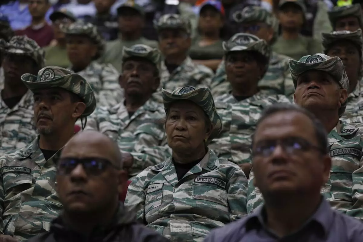 Members of the Bolivarian Militia listen to a recorded speech by President Nicolás Maduro at a military garrison in Caracas, Venezuela, Friday, Sept. 5, 2025. (AP Photo/Cristrian Hernandez)