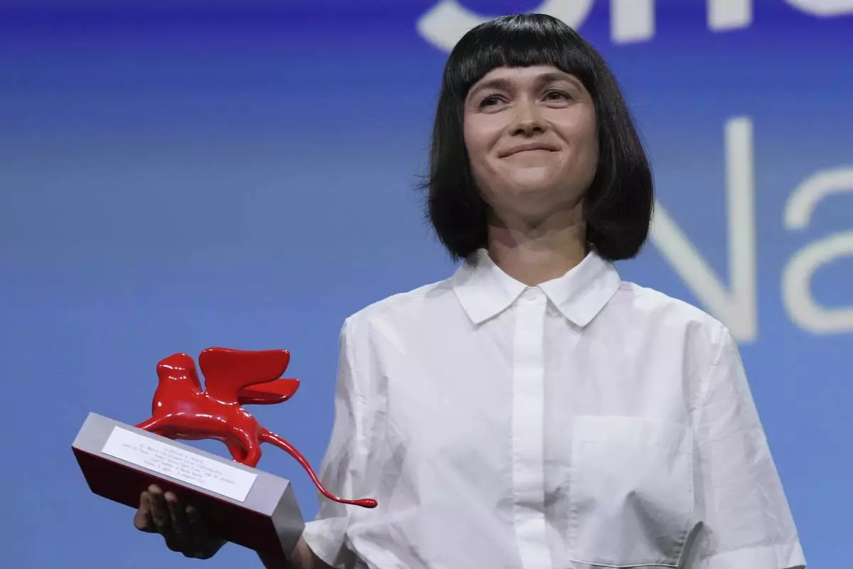 Director Nastia Korkia accepts the Lion of the future award for best debut film for 'Short Summer' during the awards ceremony of the 82nd edition of the Venice Film Festival in Venice, Italy, on Saturday, Sept. 6, 2025. (Photo by Alessandra Tarantino/Invision/AP)