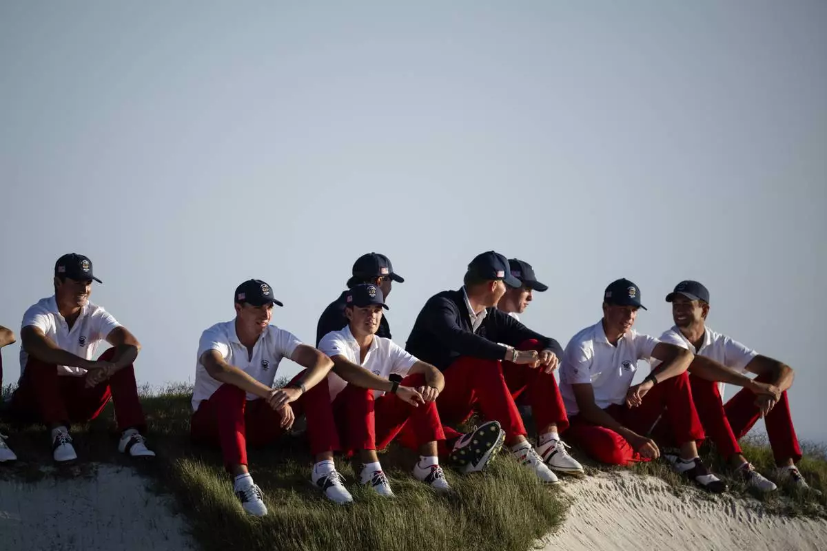 The USA team players watch from the 17th green as they play the Great Britain and Ireland team during Walker Cup golf matches at Cypress Point Club, Saturday, Sept. 6, 2025, in Pebble Beach, Calif. (AP Photo/Thien-An Truong)