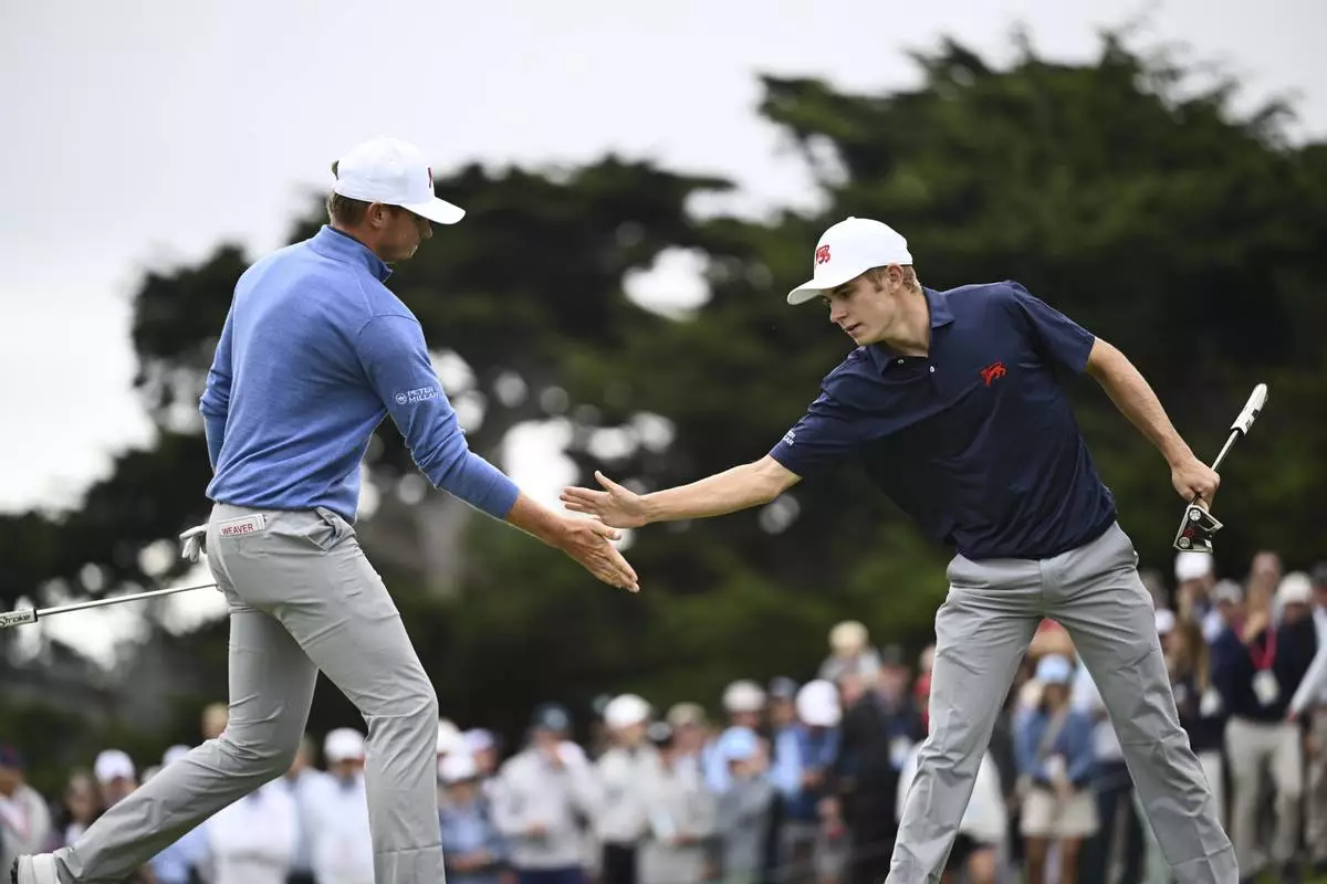 The Great Britain and Ireland team's Connor Graham, right, shakes hands with Tyler Weaver after sinking a putt on the 14th green during Walker Cup golf matches against the USA team at Cypress Point Club on Saturday, Sept. 6, 2025, in Pebble Beach, Calif. (AP Photo/Thien-An Truong)