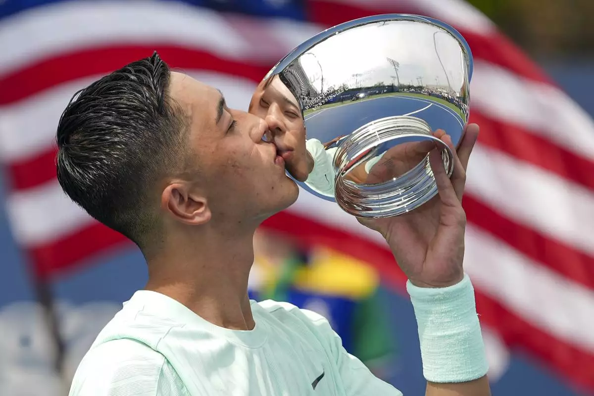 Tokito Oda, of Japan, kisses the championship trophy after defeating Gustavo Fernandez, of Argentina, in the wheelchair men's singles final of the U.S. Open tennis championships, Saturday, Sept. 6, 2025, in New York. (AP Photo/Frank Franklin II)