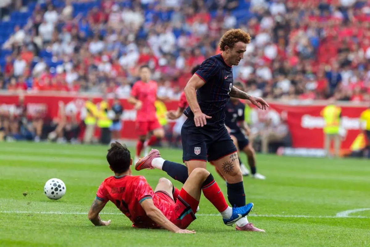 United States' Josh Sargent, left, battles for the ball against South Korea's Kim Min-jae, right, during a friendly soccer match at Sport Illustrator Stadium on Saturday, Sept. 6, 2025, in Harrison, N.J. (AP Photo/Andres Kudacki)