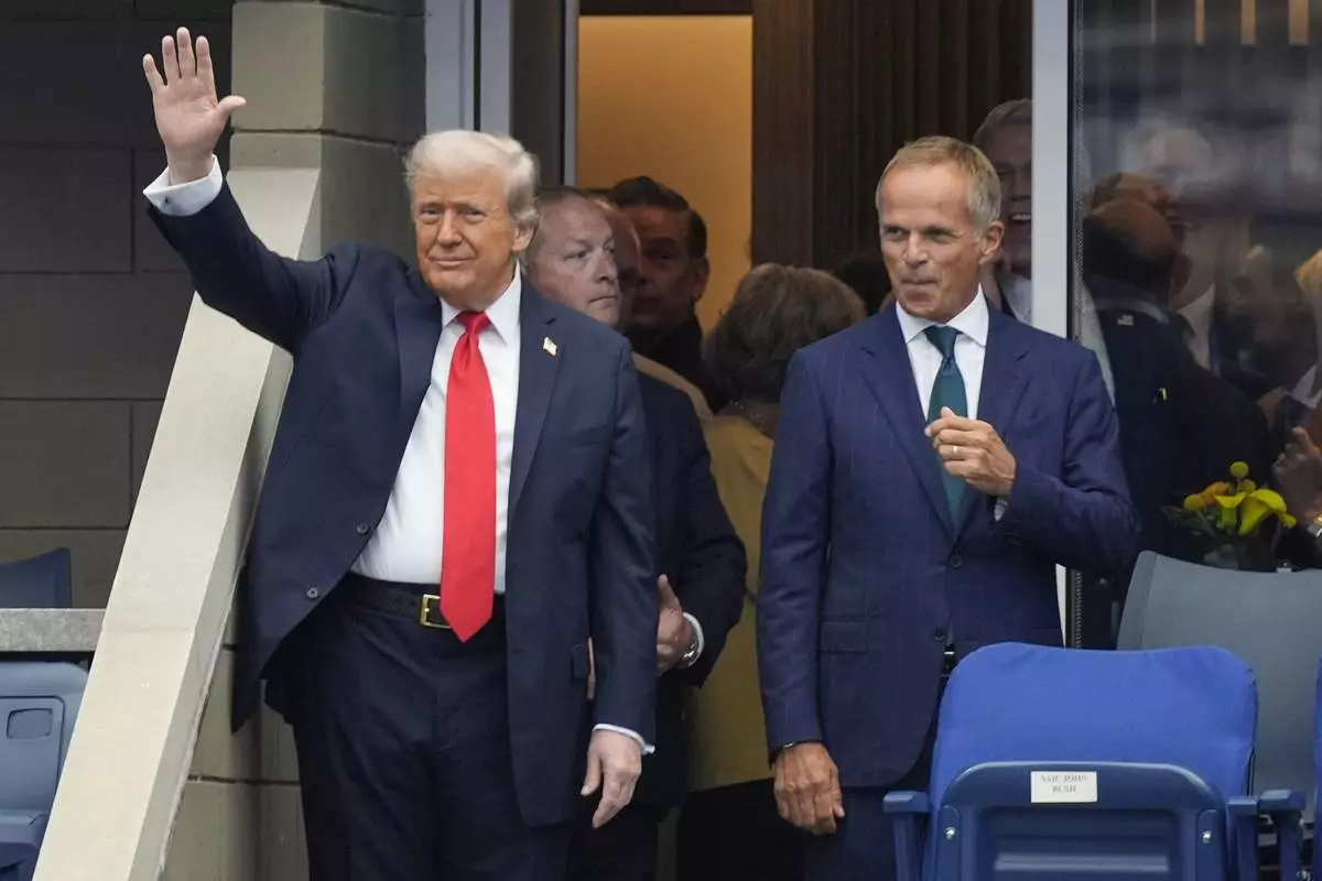 President Donald Trump waves as he arrives at the US Open tennis men's singles final Sunday, Sept. 7, 2025, in Flushing, N.Y. (AP Photo/Manuel Balce Ceneta)