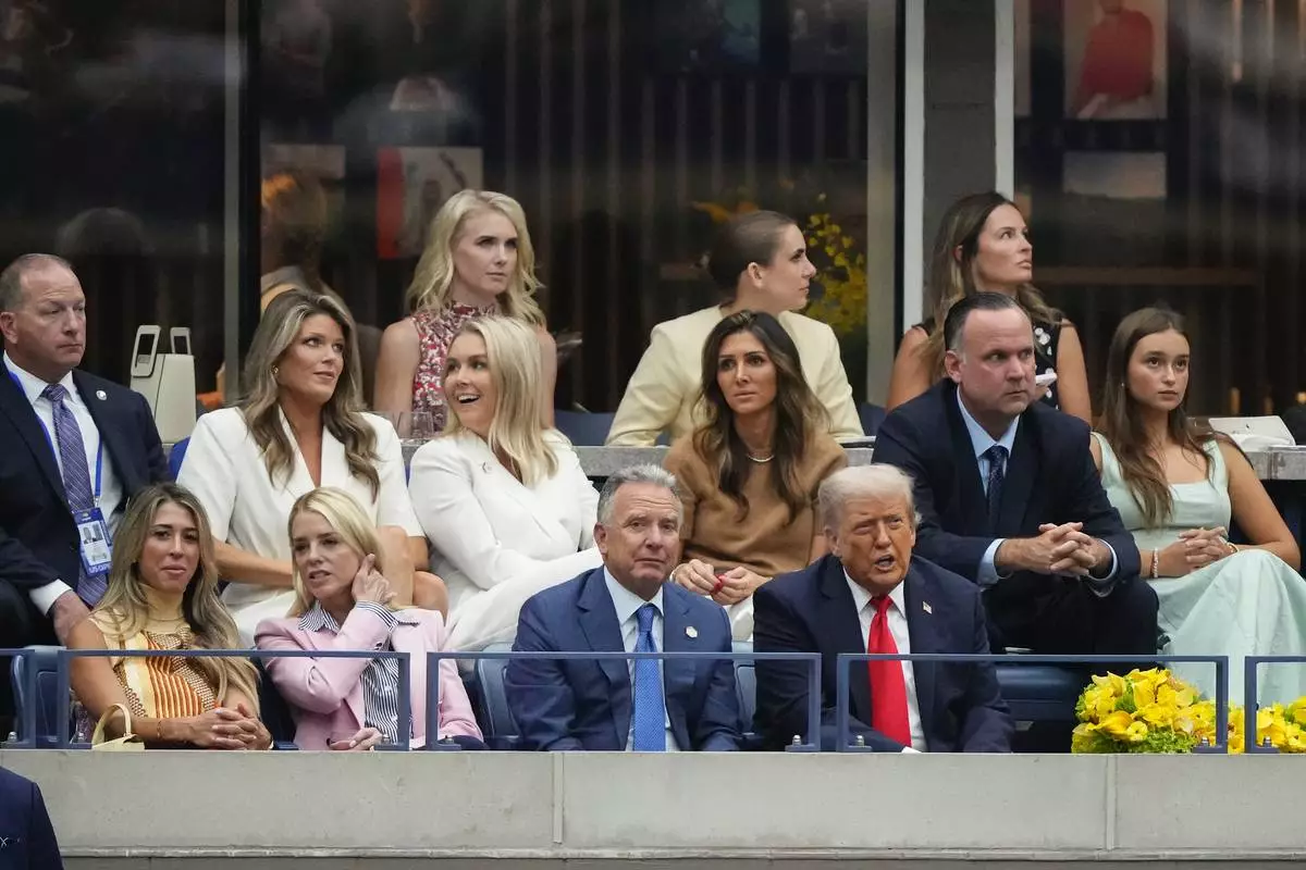 President Donald Trump, joined by Steve Witkoff, U.S. Attorney General Pam Bondi, Karoline Leavitt, White House press secretary, Lindsey Halligan, White House Deputy Chief of Staff, Dan Scavino, and Arabella Kushner, watches play between Carlos Alcaraz, of Spain, and Jannik Sinner, of Italy, during the men's singles final of the U.S. Open tennis championships, Sunday, Sept. 7, 2025, in New York. (AP Photo/Yuki Iwamura)