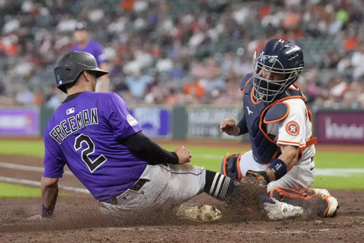 Colorado Rockies' Tyler Freeman (2) is tagged out at home plate by Houston Astros catcher César Salazar during the fifth inning of a baseball game Thursday, Aug. 28, 2025, in Houston. (AP Photo/David J. Phillip)