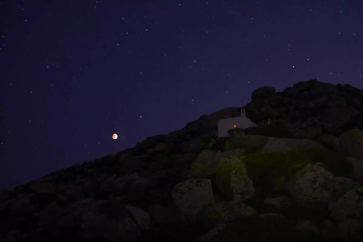 The moon glows red during a total lunar eclipse above the chapel of Panagia Skepasti near Volax village, on the island of Tinos, Greece, Sunday, Sept. 7, 2025. (AP Photo/Petros Giannakouris)