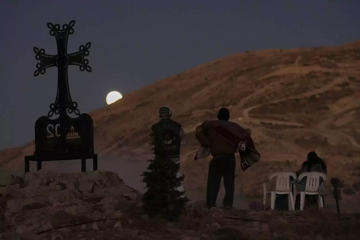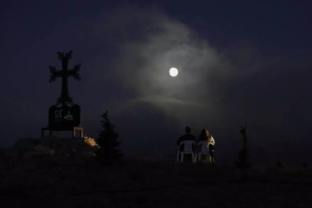 A Lebanese couple watch as the moon shines during a total lunar eclipse over Kfardebian village, northeast of Beirut, Lebanon, Sunday, Sept. 7, 2025. (AP Photo/Bilal Hussein)