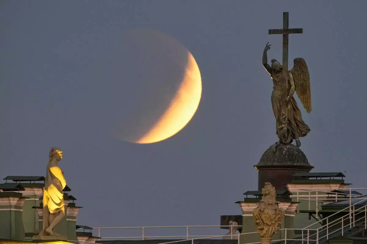 The full moon rises behind a statue of an angel fixed atop the Alexander Column at the Palace Square for a total lunar eclipse in St. Petersburg, Russia, Sunday, Sept. 7, 2025. (AP Photo/Dmitri Lovetsky)