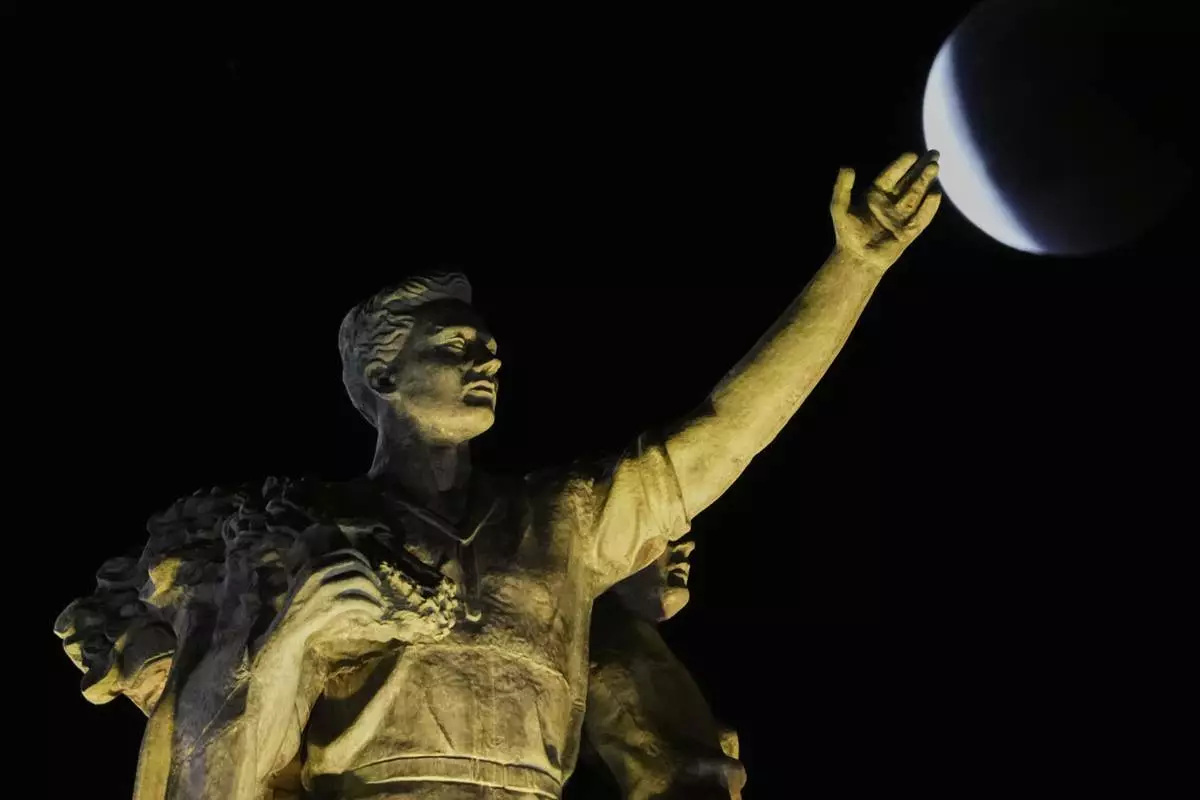 The full moon rises behind a sculpture atop of the central pavilion of the VDNKh, The Exhibition of Achievements of National Economy, during a total moon eclipse in Moscow, Russia, Sunday, Sept. 7, 2025. (AP Photo/Pavel Bednyakov)