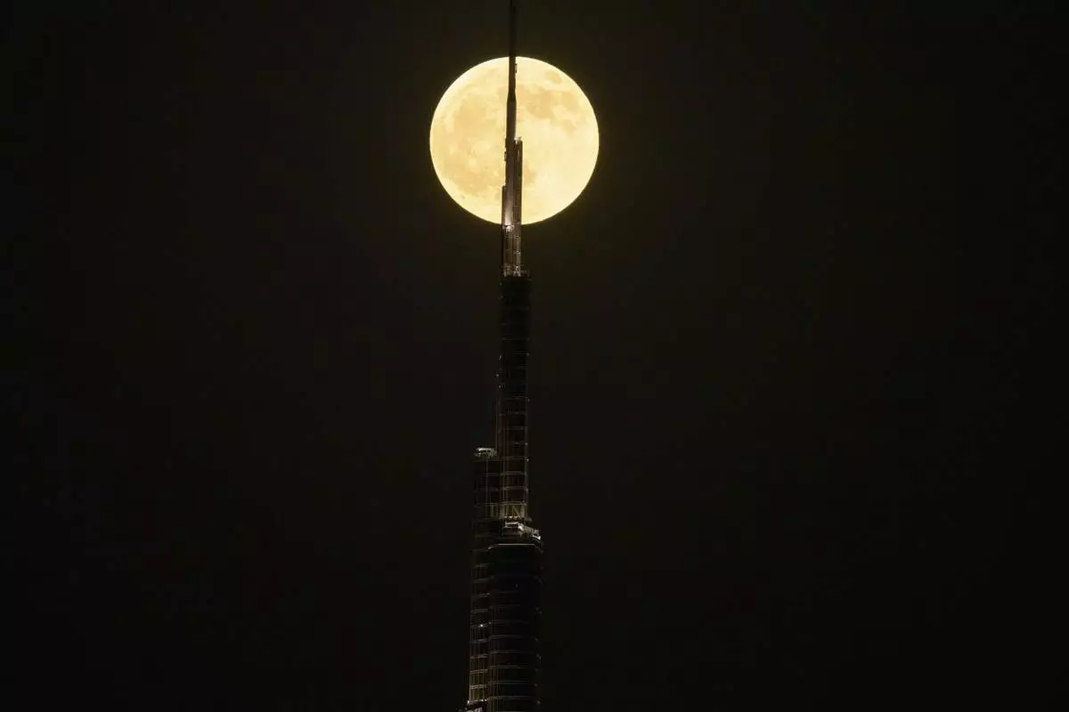 A "blood moon" is seen behind Burj Khalifa on Sunday, Sept. 7, 2025, ahead of a total lunar eclipse as the Sun, Earth and Moon align perfectly in Dubai, United Arab Emirates. (AP Photo/ Fatima Shbair)