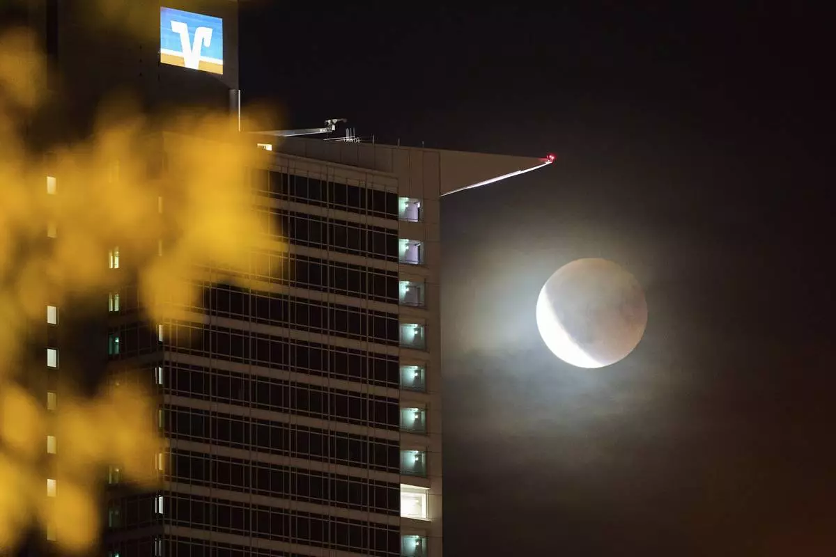 A partial lunar eclipse is seen in Frankfurt, Germany, Sunday, Sept. 7, 2025. (AP Photo/Michael Probst)