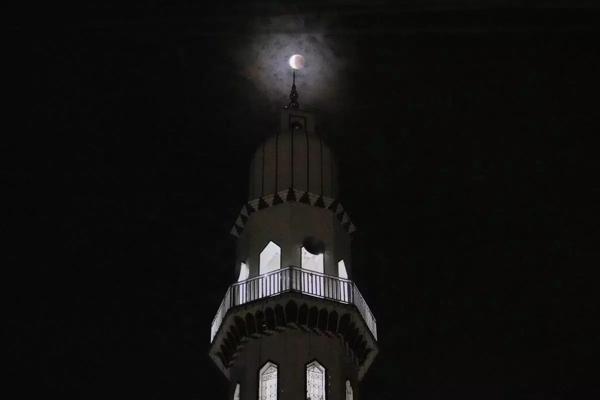 A partial lunar eclipse known as the blood moon, is seen through the minaret of a mosque in Rawalpindi, Pakistan, Monday, Sept. 8, 2025. (AP Photo/Anjum Naveed)