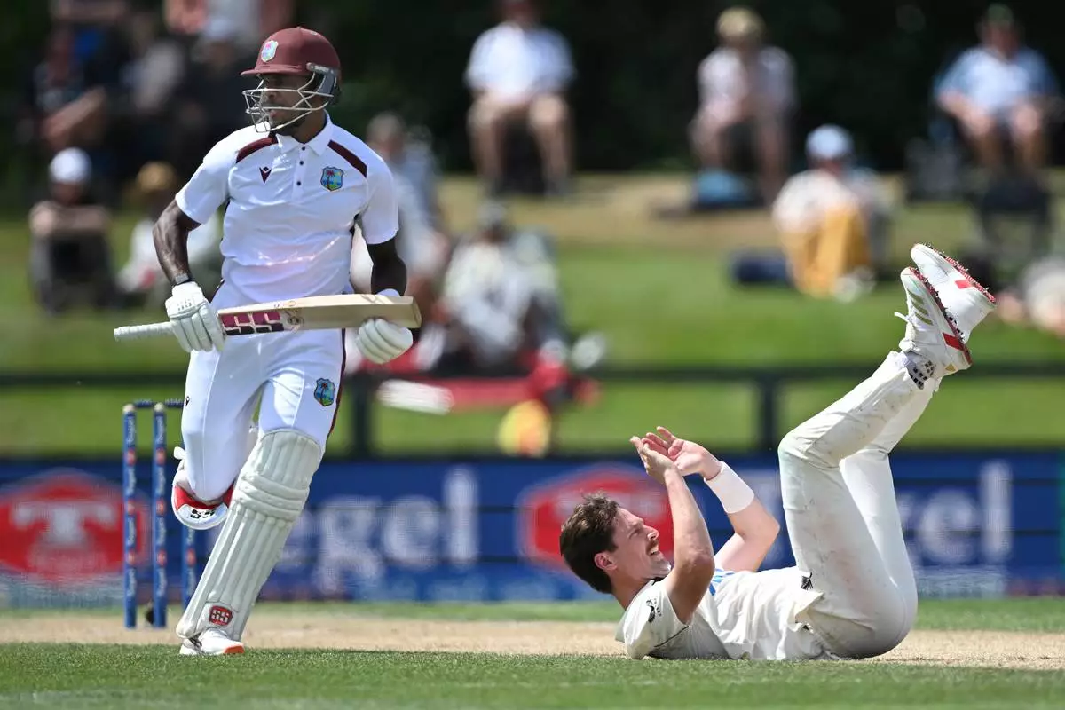 After New Zealand’s innings ended, John Campbell (15) and Tagenarine Chanderpaul (6) carried the West Indies through to lunch. Then Duffy removed both openers in a quick double strike after the break. Bracewell removed Alick Athanaze (5) and Henry dismissed Roston Chase (4) leaving the West Indies 72-4.