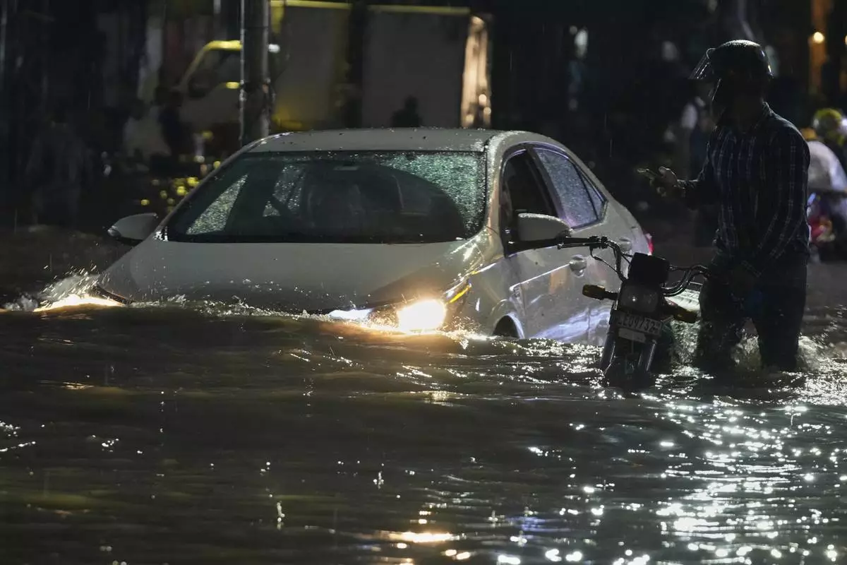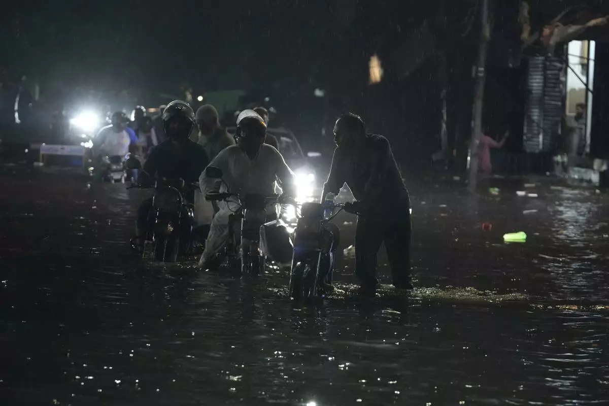 Motorcycles move through a flooded road caused by heavy rain in Lahore, Pakistan, Monday, Sept. 8, 2025. (AP Photo/K.M. Chaudary)