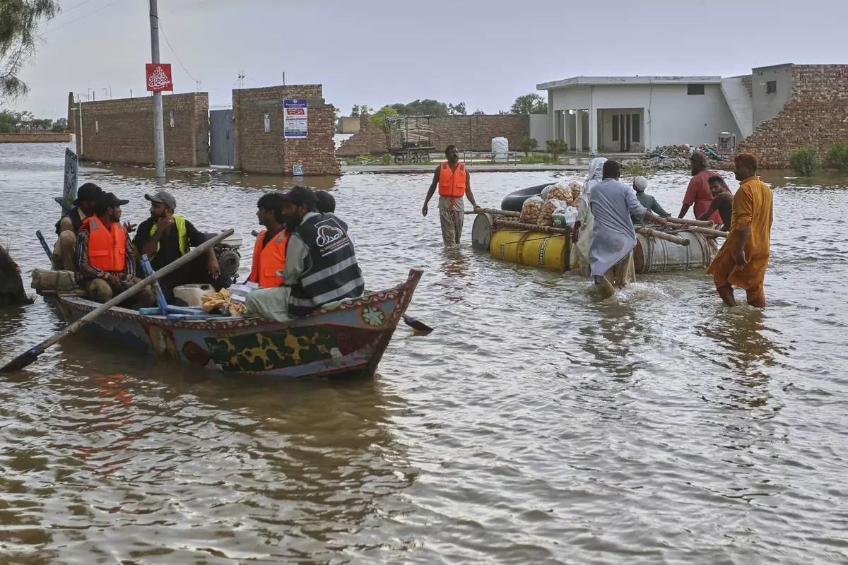 Volunteers evacuate villagers from a flooded area following heavy rains and raising water in rivers, in Muzaffargarh, Pakistan, Thursday, Sept. 4, 2025. (AP Photo/Asim Tanveer)