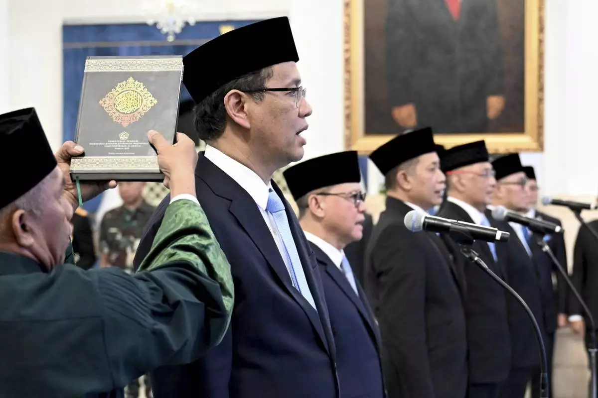 In this photo released by the Press and Media Bureau of the Indonesian Presidential Palace, an Islamic cleric holds a holy book of Quran over the head of the new Finance Minister Purbaya Yudhi Sadewa as he takes his oath with other newly appointed ministers and vice ministers during a swearing in ceremony at the State Palace in Jakarta, Indonesia, Monday, Sept. 8, 2025. (Cahyo Bruri Sasmito, Indonesian Presidential Palace via AP)