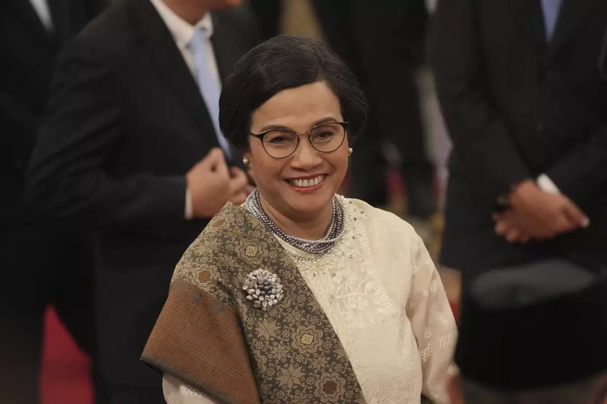 FILE - Indonesia's newly-appointed Finance Minister Sri Mulyani Indrawati smiles before the start of the swearing-in ceremony of the new cabinet ministers at the presidential palace in Jakarta, Indonesia, Monday, Oct. 21, 2024. (AP Photo/Achmad Ibrahim, File)