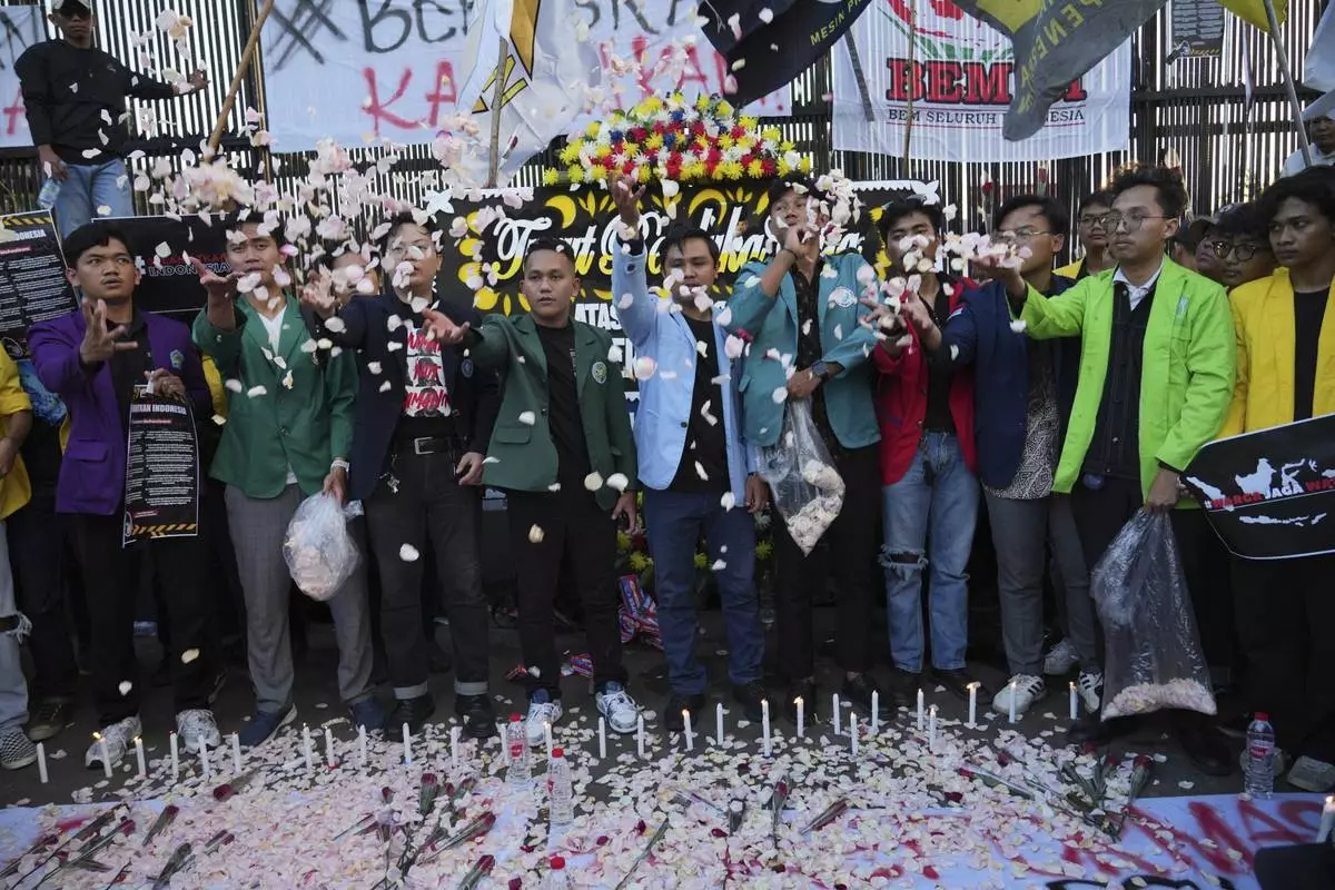 Student protesters throw flowers during a rally against corruption, politicization of law, and lavish allowances given to parliament members, outside the parliament building in Jakarta, Indonesia Thursday, Sept. 4, 2025. (AP Photo/Tatan Syuflana)
